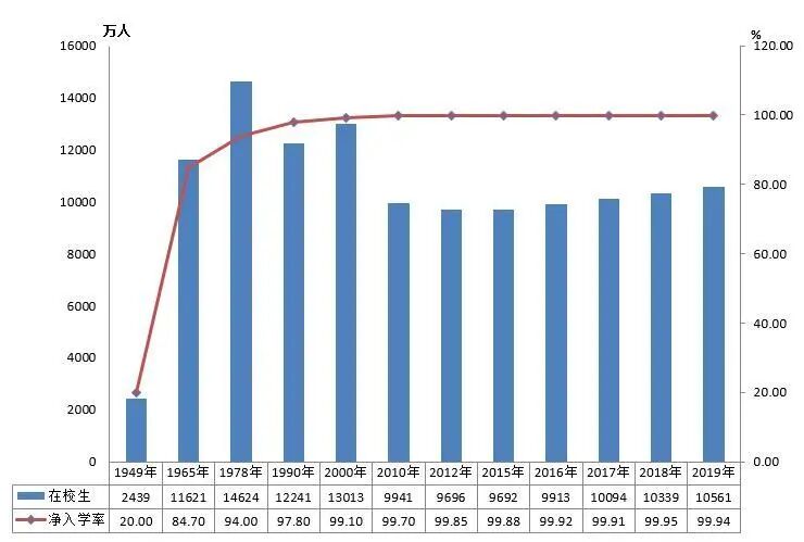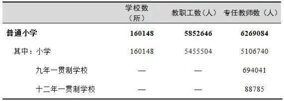 普通小学16.01万所,比上年减少0.17万所,下降1.03%。另有小学教学点9.65万个,比上年减少0.49万个。招生1869.04万人,比上年增加1.74万人,增长0.09%;在校生10561.24万人,比上年增加221.98万人,增长2.15%;毕业生1647.90万人,比上年增加31.41万人,增长1.94%。小学学龄儿童净入学率[6]99.94%。