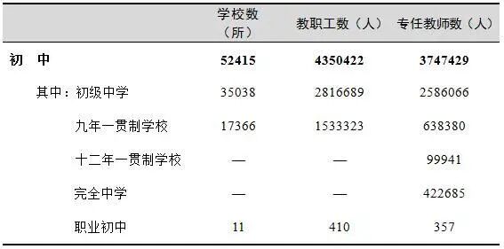 初中学校5.24万所(含职业初中11所),比上年增加433所,增长0.83%。招生1638.85万人,比上年增加36.26万人,增长2.26%;在校生4827.14万人,比上年增加174.55万人,增长3.75%;毕业生1454.09万人,比上年增加86.33万人,增长6.31%。初中阶段毛入学率[4]102.6%。