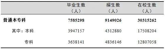 普通本专科招生914.90万人,比上年增加123.91万人,增长15.67%;在校生3031.53万人,比上年增加200.49万人,增长7.08%;毕业生758.53万人,比上年增加5.22万人,增长0.69%。另有五年制高职转入专科招生46.00万人;专科起点本科招生31.75万人。