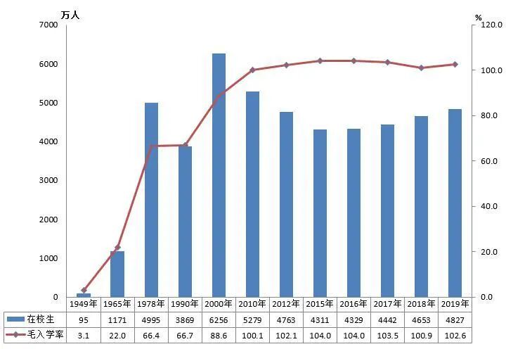 [4]毛入学率,是指某一级教育不分年龄的在校学生总数占该级教育国家规定年龄组人口数的百分比。由于包含非正规年龄组(低龄或超龄)学生,毛入学率可能会超过100%。